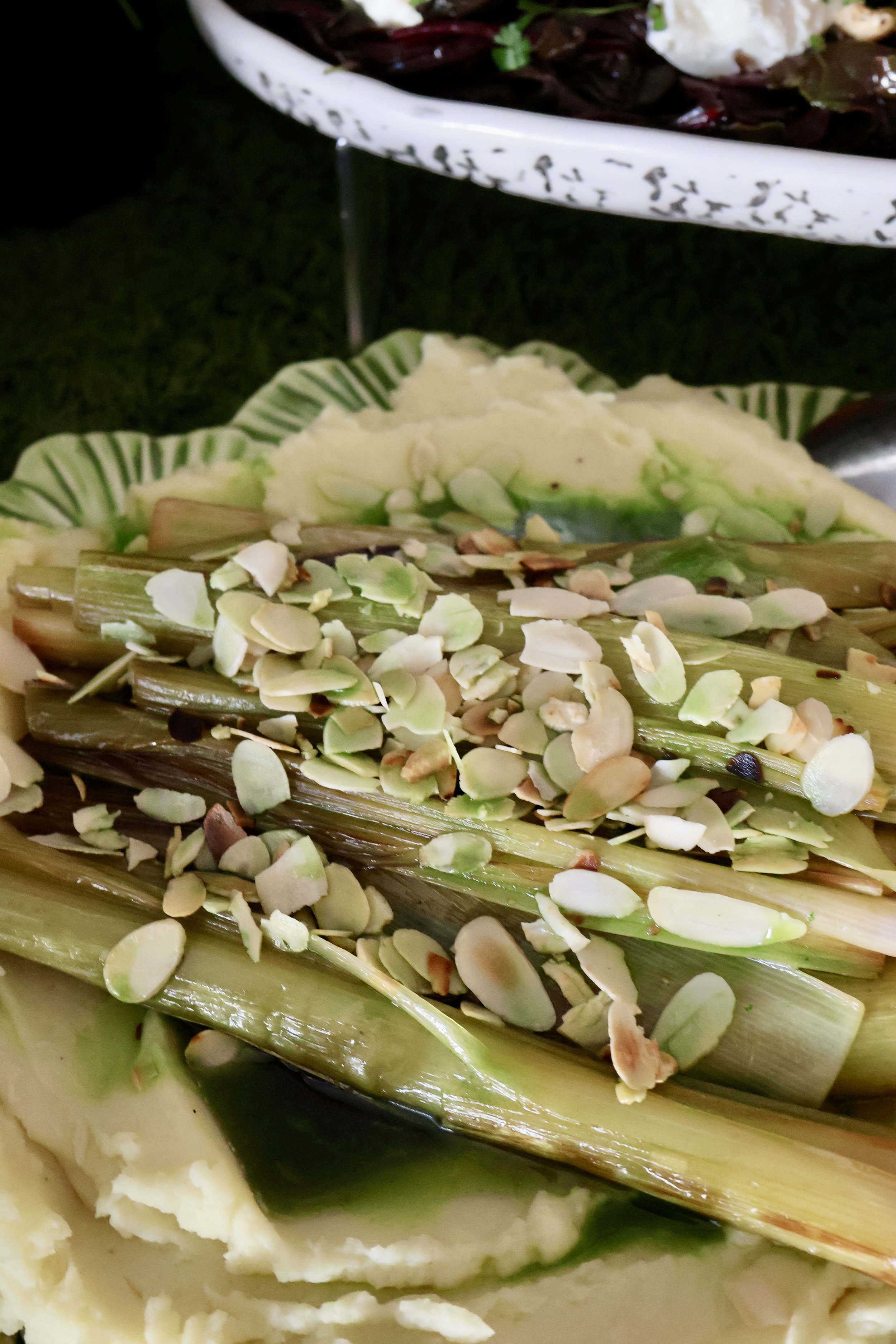 Leeks look rustic before plating - they transform on the plate with some herb oil and toasted almonds
